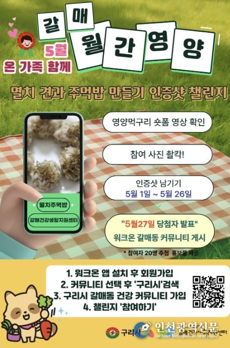 [인천광역신문] 최예준 기자 | 구리시 갈매건강생활지원센터는 오는 5월 1일부터 5월 26일까지 주민 주도형 식습관 개선 사업의 일환으로 ‘우리 가족 뼈 건강 지킴이! 멸치 견과 주먹밥 만들기 인증 사진 참여 잇기(챌린지)’를 추진한다고 밝혔다.