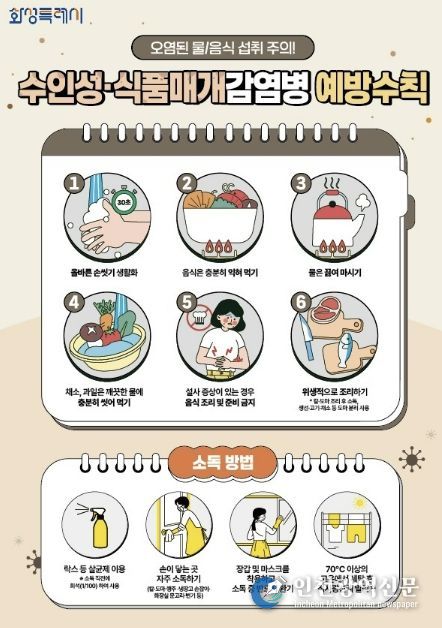 주요 예방수칙은 ▲흐르는 물에 비누로 30초 이상 손 씻기 ▲음식은 충분히 익혀 먹기 ▲물은 끓여 마시기 ▲채소와 과일은 깨끗이 씻어 섭취하기 ▲설사 증상 시 음식 조리 금지 ▲조리기구 구분 사용 등이다.