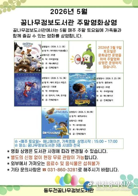 [인천광역신문] 최예준 기자 | 동두천시 도서문화사업소 정보도서관에서는 오는 5월 매주 토요일 어린이와 가족을 위한 애니매이션 및 가족영화 4편을 상영한다고 밝혔다.