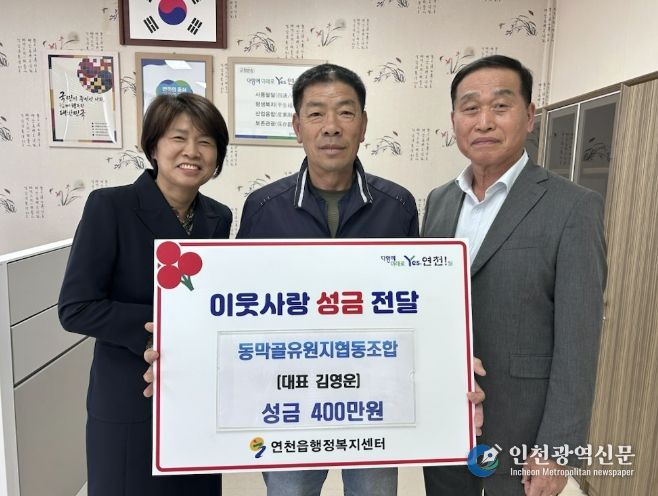 [인천광역신문] 최예준 기자 | 동막골유원지협동조합은 지난 28일 오후 4시 연천읍행정복지센터 읍장실에서 이웃돕기 후원 성금 400만 원을 기탁했다.
