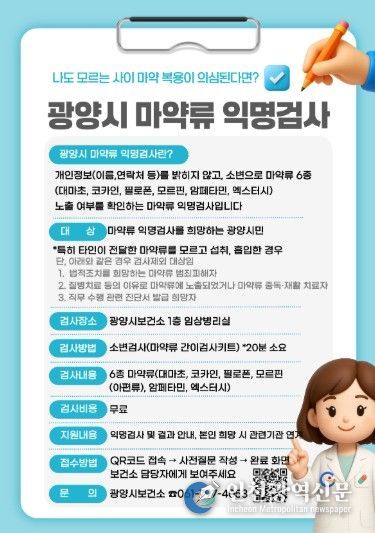 [인천광역신문] 최예준 기자 | 광양시보건소는 마약류 노출이 의심되거나 검사를 희망하는 시민을 대상으로 ‘마약류 무료 익명검사’를 실시한다고 밝혔다.
