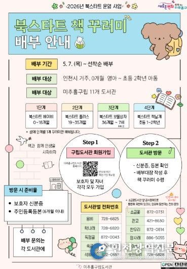 아울러 미추홀 구립도서관은 책 꾸러미 배부와 연계한 ‘북 스타트 책놀이 프로그램’도 운영한다. 용비·학나래·석바위·이랑도서관 4개 관에서 매주 목요일 오전 11시부터 12시까지 ‘북 스타트 책놀이 프로그램’이 진행되며, 자세한 일정과 참여 방법은 각 도서관 누리집 공지 사항을 통해 확인할 수 있다.