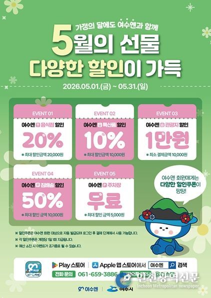 시 관계자는 “가정의 달을 맞아 관광객들이 ‘여수엔’을 통해 다양한 할인 혜택과 축제 연계 프로그램을 함께 즐기며 더욱 풍성한 여행이 되길 바란다”며 “앞으로도 체감도 높은 혜택과 즐길 거리를 지속 확대해 나가겠다”고 말했다.