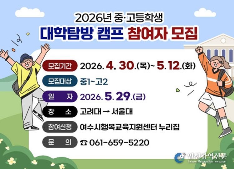 [인천광역신문] 최예준 기자 | 여수시는 오는 30일부터 관내 중학교 1학년부터 고등학교 2학년 학생들을 대상으로 ‘2026년 중·고등학생 대학 탐방 캠프’ 참여자를 모집한다.