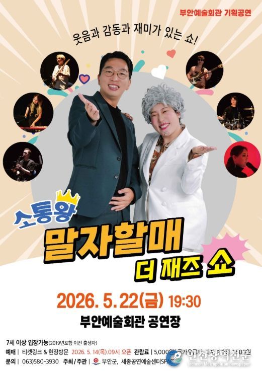 [인천광역신문] 최예준 기자 | 부안군은 오는 5월 22일 오후 7시 30분 부안예술회관 공연장에서 기획 공연 ‘소통왕 말자할매 더 재즈 SHOW’를 공연한다고 밝혔다.