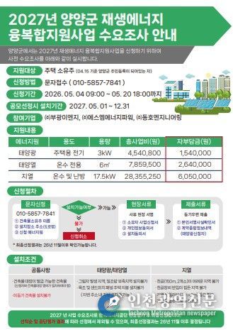 [인천광역신문] 최예준 기자 | 양양군이 에너지 비용 절감과 온실가스 감축을 위한 ‘2027년 신재생에너지 융복합지원사업’ 공모 신청을 위해 오는 5월 4일부터 20일까지 사업 참여 희망자를 모집한다.