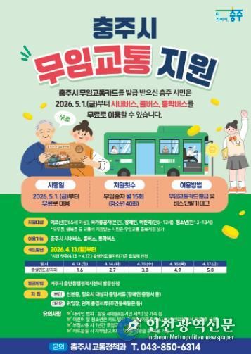 [인천광역신문] 최예준 기자 | 충주시가 교통약자의 이동 편의를 높이고 사회활동 참여를 독려하기 위해 오는 5월 1일부터 ‘충주시 어르신 등 무임교통 지원 사업’을 전격 시행한다고 밝혔다.
