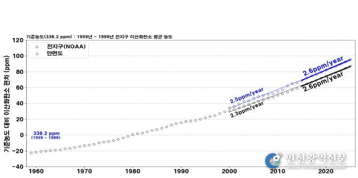 보고서에 따르면 우리나라의 2025년 이산화탄소 배경농도(432.7 ppm, 2024년 429.5 ppm)는 전지구 평균(425.6 ppm, 2024년 422.8 ppm)보다 7.1 ppm 높은 수준을 기록했다. 전년 대비 3.2 ppm 상승해 최근 10년(2015~2024) 기간 중 두 번째로 큰 연간 증가폭을 보였다. 또한, 우리나라에서 가장 오랜 기간(1999년~) 관측해 온 안면도 이산화탄소 관측 결과를 근거로 우리나라 이산화탄소 배경농도는 2000년 이후 연 2.5 ppm씩 높아지고 있고, 최근 10년에는 연 2.6 ppm의 속도로 증가하고 있다고 밝혔다. 아울러, 전지구 평균 증가 속도는 2000년 이후 연 2.3 ppm, 최근 10년 연 2.6 ppm이다.
