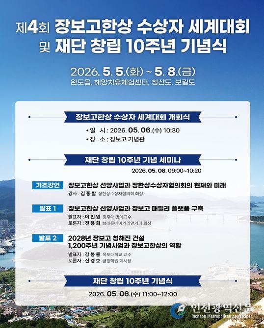 [인천광역신문] 최예준 기자 | 사단법인 장보고글로벌재단(이사장 김덕룡)이 창립 10주년 기념식 및 제4회 장보고한상 수상자 세계대회를 5월 5일부터 8일까지 완도에서 개최한다고 밝혔다.
