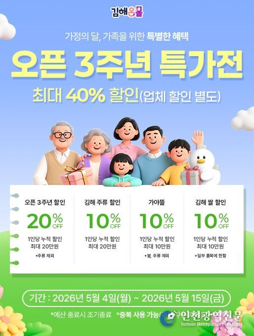 [인천광역신문] 최예준 기자 | 김해의생명·산업진흥원은 김해시 통합 온라인 쇼핑몰 ‘김해온몰’ 오픈 3주년과 5월 가정의 달을 맞아 파격 특가전을 진행한다고 밝혔다.