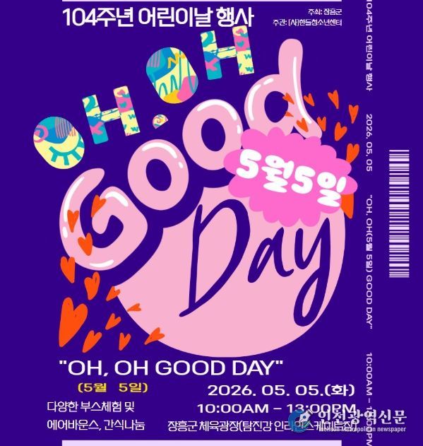 [인천광역신문] 최예준 기자 | 장흥군은 5월 5일 어린이날을 맞아 오전 10시부터 오후 1시까지 탐진강변 체육공원에서 ‘OH.OH.(5월 5일) Good Day!’ 행사를 개최한다.