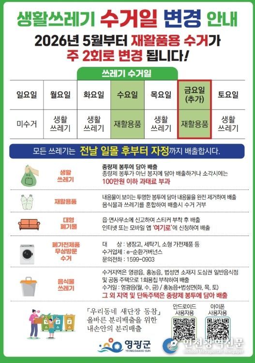 [인천광역신문] 최예준 기자 | 영광군은 재활용품 분리배출 활성화와 생활폐기물 불법 배출 방지를 위해 재활용품 수거일을 기존 주 1회에서 주 2회로 확대 운영한다고 밝혔다.