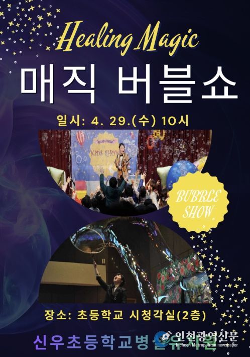 [인천광역신문] 최예준 기자 | 신우초등학교병설유치원은 4월 29일 교내 시청각실에서 ‘힐링 매직버블쇼’ 공연을 개최했다고 밝혔다. 이번 공연은 유아들이 직접 참여하며 즐길 수 있는 체험형 프로그램으로 마련됐다.