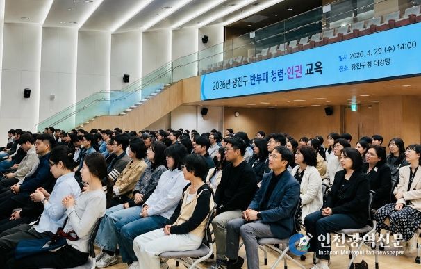 [인천광역신문] 최예준 기자 | 광진구가 4월 29일 광진구청 대강당에서 공직윤리 확립과 상호 존중하는 조직문화 조성을 위한 ‘반부패 청렴·인권 교육’을 실시했다.