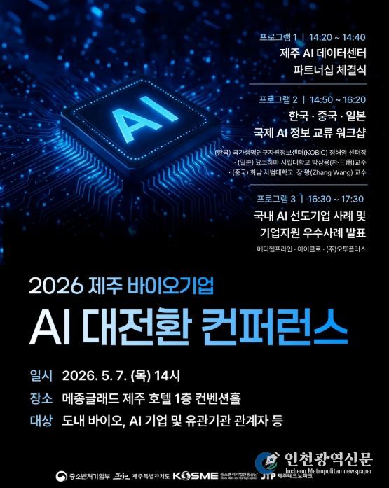 [인천광역신문] 최예준 기자 | 제주테크노파크(원장 지영흔, 제주TP)는 오는 5월 7일 오후 2시 메종글래드 제주 호텔에서 도내외 바이오 및 AI 산업 관계자 100여 명을 대상으로 ‘제주 바이오기업 AI 대전환(DX) 컨퍼런스’를 개최한다고 30일 밝혔다.