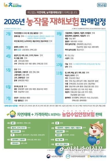 현재 감귤(만감류)·대파를 비롯해 원예시설, 단호박 등 13개 품목 보험이 판매되고 있다. 가입기간은 작물별 재배 시기에 따라 다르다. 다만, 농작물재해보험과 농업수입안정보험은 중복해서 가입할 수 없다.