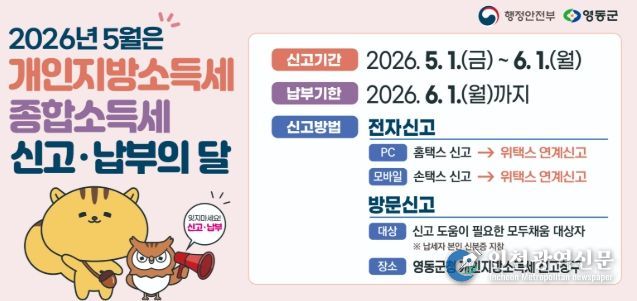 [인천광역신문] 최예준 기자 | 충북 영동군은 2025년 귀속 개인지방소득세(종합소득세) 신고·납부 기간을 운영하며, 군민들의 원활한 신고를 위해 다양한 편의를 제공한다고 밝혔다.