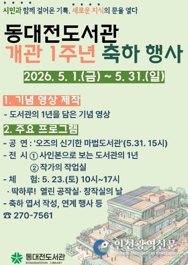 [인천광역신문] 최예준 기자 | 동대전도서관은 5월 1일부터 31일까지 개관 1주년을 맞아 시민과 함께한 지난 1년의 발자취를 돌아보고 다양한 기념행사를 개최한다.