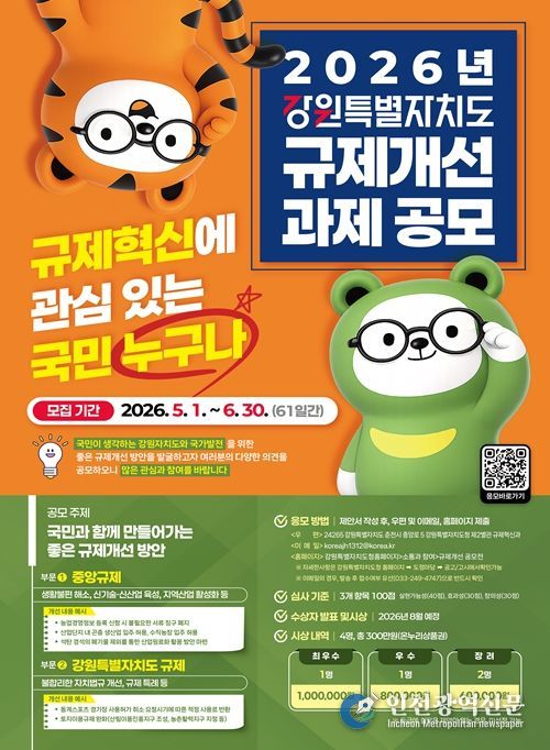 [인천광역신문] 최예준 기자 | 강원특별자치도는 국민과 함께 만들어가는 좋은 규제 개선을 주제로 2026. 5. 1.부터 6. 30.까지 전 국민을 대상으로 '2026년 강원특별자치도 규제개선 과제 공모'를 추진한다.