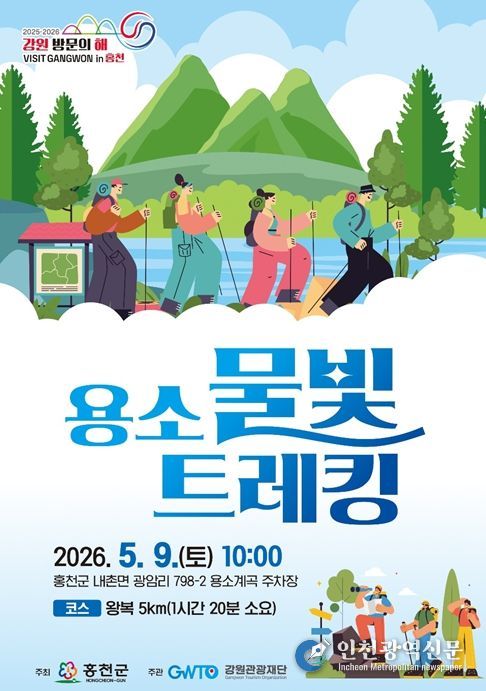 [인천광역신문] 최예준 기자 | 강원관광재단은 홍천군과 함께 오는 5월 9일 오전 10시 홍천군 내촌면 용소계곡 일원(광암리 798-2)에서 ‘용소 물빛 트레킹’ 행사를 개최한다고 밝혔다.