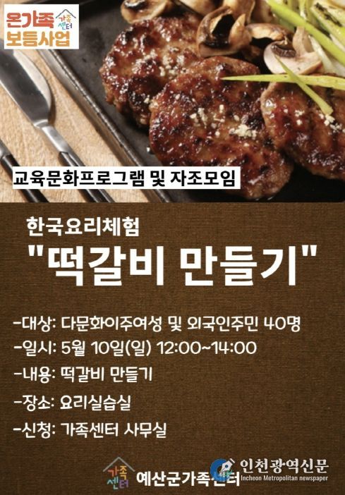 [인천광역신문] 최예준 기자 | 예산군가족센터는 지역 내 결혼이주여성과 외국인 주민의 한국문화 이해 증진과 안정적인 정착 지원을 위해 오는 5월 10일 한국전통요리 체험 ‘떡갈비 만들기’ 프로그램을 운영한다고 밝혔다.