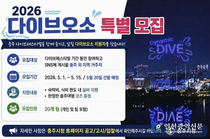 [인천광역신문] 최예준 기자 | 충주시가 ‘2026 충주 다이브 페스티벌 with MyK FESTA’을 맞아 지역 관광의 매력을 널리 알릴 특별 홍보단 ‘다이브 오소(O-SO) 충주’ 참여자를 모집한다고 밝혔다.