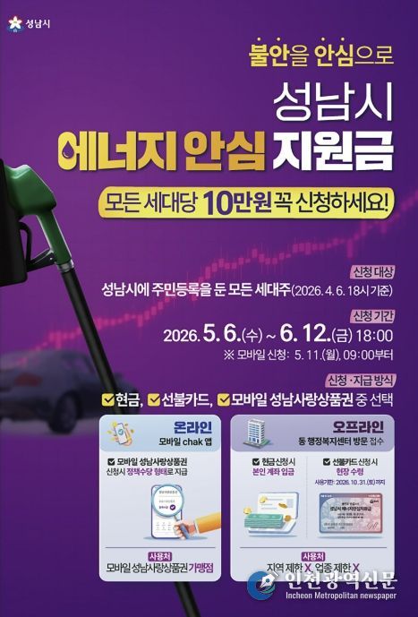 [인천광역신문] 최예준 기자 | 성남시는 중동 사태에 따른 국가 자원안보 위기 경보 발령으로 경제적 부담이 커진 시민들을 지원하기 위해 전국 최초로 ‘성남시 에너지 안심지원금’을 오는 5월 6일부터 신청을 받는다고 밝혔다.