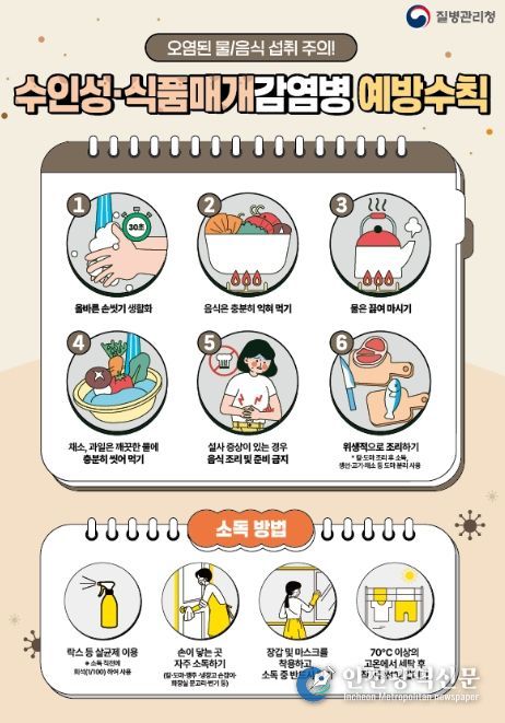 수인성ㆍ식품매개감염병은 병원성 세균, 바이러스, 원충에 오염된 물이나 식품을 섭취해 구토, 설사, 복통 등의 장관 증상을 유발한다. 이를 예방하기 위해서는 ▲올바른 손 씻기 생활화 ▲음식 충분히 익혀 먹기 ▲물 끓여 마시기 ▲채소ㆍ과일 깨끗한 물에 충분히 씻어 먹기 ▲설사 증상 시 음식 조리 및 준비 금지 ▲위생적으로 조리하기 등 예방수칙을 준수해야 한다.
