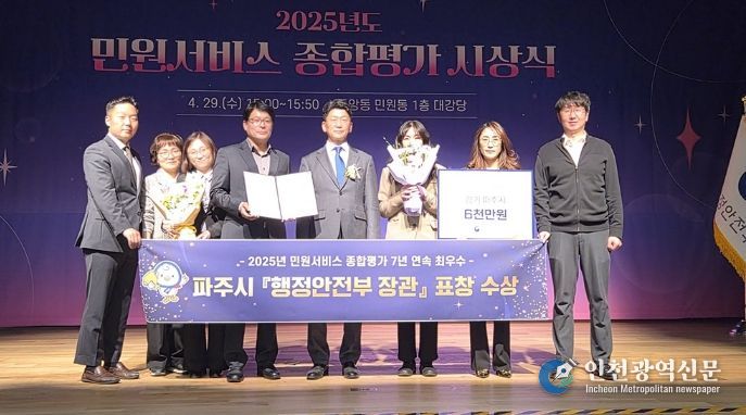 [인천광역신문] 최예준 기자 | 파주시는 지난 29일 정부세종청사 대강당에서 열린 녩년 민원서비스 종합평가’시상식에서 행정안전부 장관 표창을 수상하고, 시상금으로 특별교부세 6천만 원을 확보했다.