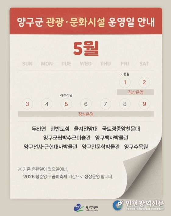 [인천광역신문] 최예준 기자 | 양구군은 ‘2026 청춘양구 곰취축제’ 기간 동안 관광객 편의 증진과 지역 관광 활성화를 위해 관내 주요 관광·문화시설을 휴관일 없이 정상 운영한다.