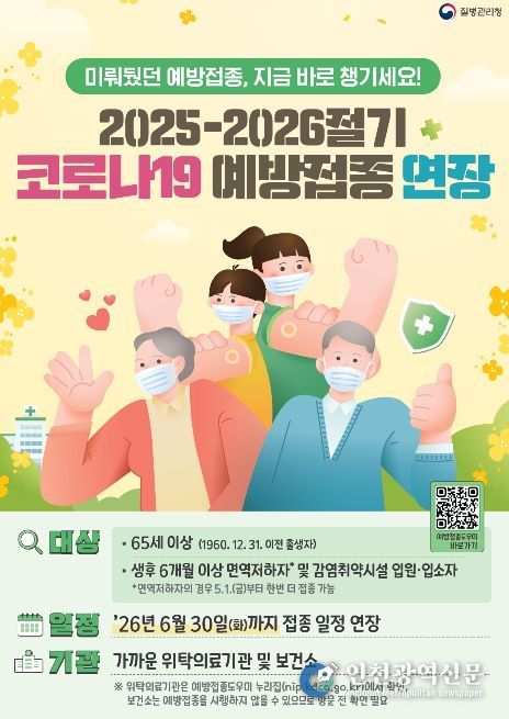[인천광역신문] 최예준 기자 | 서울 서초구는 코로나19 고위험군을 대상으로 이달 30일 종료 예정이던 '’25-‘26절기 코로나19 국가무료 예방접종' 기한을 6월 30일까지 연장한다고 밝혔다.