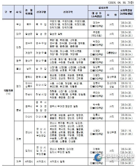 [인천광역신문] 최예준 기자 | 중앙선거관리위원회는 6월 3일 제9회 전국동시지방선거와 동시 실시하는 국회의원 재·보궐선거의 선거구가 14곳으로 다음과 같이 확정됐다고 밝혔다.