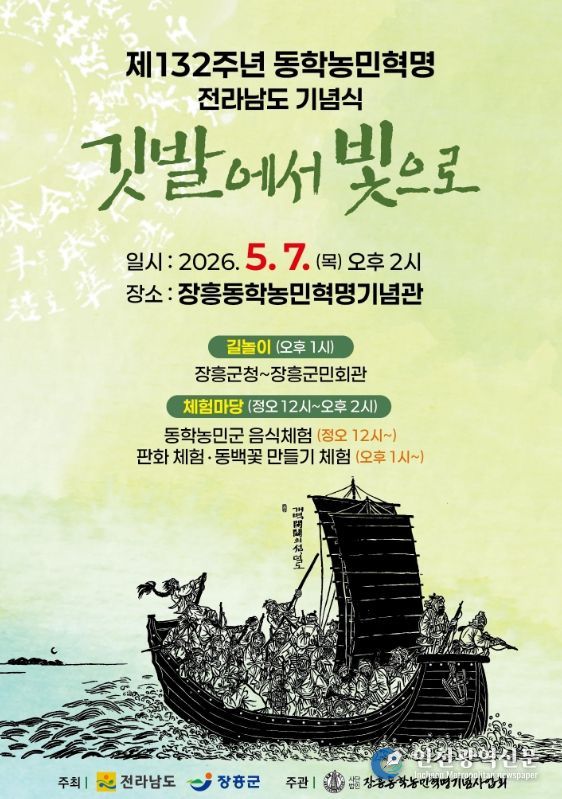 [인천광역신문] 최예준 기자 | 전라남도와 장흥군이 공동 주최하고 (사)장흥동학농민혁명기념사업회가 주관하는 ‘제132주년 동학농민혁명 전라남도 기념식’이 5월 7일 장흥에서 열린다.