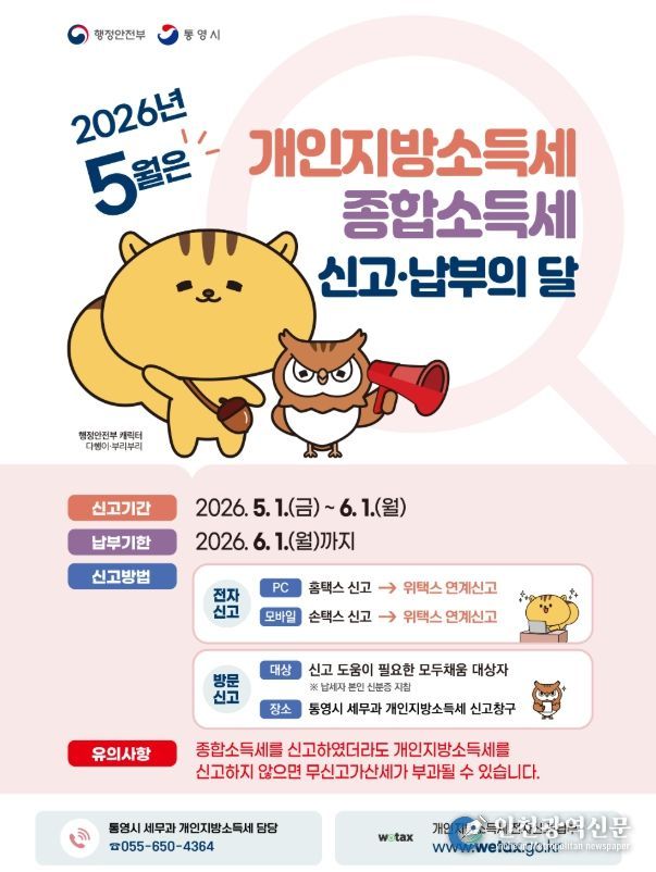 [인천광역신문] 최예준 기자 | 통영시는 5월 개인지방소득세 및 종합소득세 신고·납부의 달을 맞아 2025년도에 종합소득이 있는 개인은 오는 6월 1일(월)까지 개인지방소득세와 종합소득세를 신고·납부해야 한다고 밝혔다.