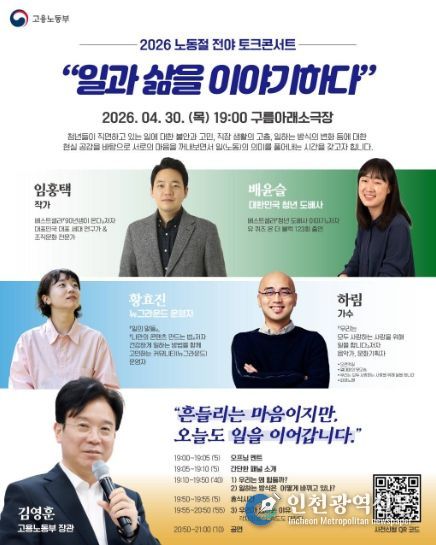 [인천광역신문] 최예준 기자 | 고용노동부는 4월 30일 저녁 7시, 서울 마포구 소재 ‘구름아래소극장’에서 청년 200여 명과 함께 일에 대한 고민을 나누며, 노동의 가치를 다시 한번 생각해 보는'일과 삶을 이야기하다' 토크콘서트를 개최했다고 밝혔다.