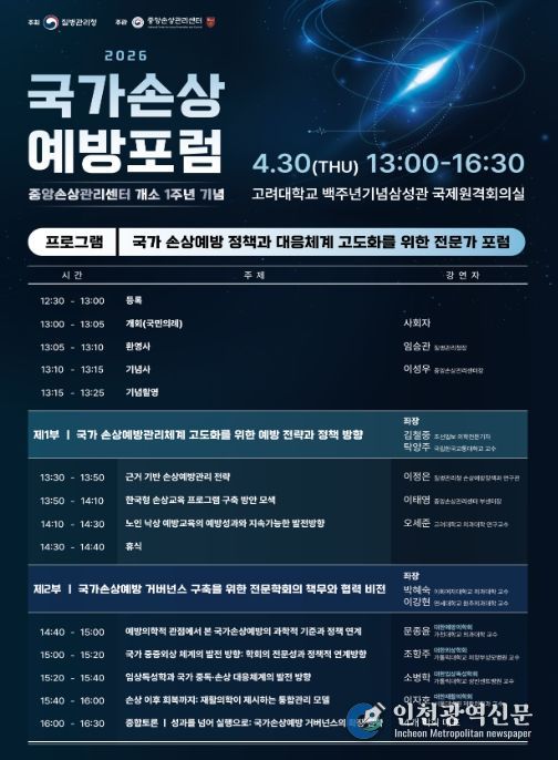 [인천광역신문] 최예준 기자 | 질병관리청은 중앙손상관리센터 개소 1주년을 맞아 4월 30일 고려대학교 백주년기념삼성관에서 「2026년 국가손상예방포럼」을 개최한다.