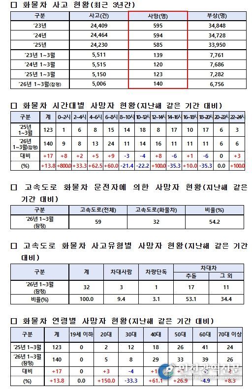 경찰청 교통사고 통계에 따르면 2026년 3월까지 발생한 화물차 사망사고(잠정)는 최근 3년 같은 기간 평균(1~3월) 발생한 사망자인 127.3명보다 9.9% 증가한 수준인 140명이 발생했다.