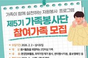 [인천광역신문] 박진 기자 | 고성군가족센터(센터장 황순옥)는 2월 1일부터 가족이 함께 실천하는 자원봉사 프로그램인 ‘제5기 가족봉사단’ 단원을 수시로 모집한다고 밝혔다. ‘제 5기 가족봉사단’은 가족 구성원이 함께 봉사활동에 참여함으로써 건강한 가족문화를 형성하고, 지역사회 나눔 활동을 통해 이웃과 마음을 이어가기 위해 기획됐다. 가족봉사단은 환경정화활동, 취약계층가정 방문 봉사활동, 고성군가족센터 프로그램 운영 지원 등 다양한 분야의 봉사활동을 매달 정기적으로 진행할 예정이다. 모집은 2026년 2월 1일부터 수시로 이루어지며, 참여 대상은 2인 이상으로 구성된 가족이면 누구나 신청 가능하다. 3월 7일 발대식을 시작으로 본격적인 활동에 들어갈 계획이며 발대식에서는 가족봉사단의 운영 취지와 연간 활동 계획을 공유하고, 참여 가족 간 소통의 시간을 마련할 예정이다. 참여를 희망하는 가족은 고성군가족센터로 방문 또는 전화 접수하면 된다. 황순옥 센터장은 “가족봉사단은 봉사를 매개로 가족이 함께 성장하고, 지역사회와 따뜻하게 연결되는 의미 있는 활동”이라며, “가족이 함께하는 나눔 활동에 관심 있는
