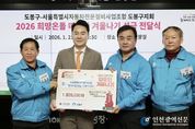 [인천광역신문] 박진 기자 | 서울 도봉구는 지난 1월 21일 서울특별시자동차전문정비사업조합 도봉구지회(약칭: 카포스 도봉구지회)로부터 따뜻한 겨울나기 이웃돕기 성금 100만 원을 전달받았다. 오언석 도봉구청장은 “카포스 도봉구지회의 소중한 마음에 감사드린다. 전해주신 성금은 꼭 필요한 이웃들에게 잘 전달될 수 있도록 하겠다.”라고 말했다. 카포스 도봉구지회(지회장 이평관)는 매년 구에 따뜻한 겨울나기 성금을 기부해 오고 있다. 성금 기부 외에도 명절에 구민의 안전한 귀성길 운행을 위해 차량 점검을 무상으로 실시하고 있다. [뉴스출처 : 서울특별시 도봉구]