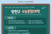 [인천광역신문] 기자 | 양천구는 오는 13일 실시되는 ‘2026학년도 대학수학능력시험’에 응시하는 관내 수험생 5천8백여 명을 위한 교통·소음·안전 등 전방위 수능 종합대책을 마련하고 본격적인 지원에 나선다. 구는 수험생들이 최적의 환경에서 시험에 응시할 수 있도록 수험장 주변 소음 방지 대책을 강화했다. 2개조 4명으로 구성된 소음대책점검반을 편성해 12일까지 수험장 주변 사전실태조사를 실시하고, 소음 유발 요인을 점검·조치할 예정이다. 또 관내 모든 건축공사장과 도로굴착공사를 주관하는 유관기관에 소음 방지 협조공문을 발송하고, 예비소집일과 시험 당일에는 소음 발생 공사를 중지하거나 자제하도록 요청했다. 특히 철저한 소음 차단이 요구되는 ‘3교시 영어 듣기평가(오후 1시 10분~1시 35분)’ 시간대를 집중 점검 구간으로 정해, 현장 통제에 만전을 기할 방침이다. 수험생의 안전한 이동을 위해 ‘특별 교통대책반’을 구성하고, 긴급 상황에 신속히 대응할 수 있도록 수능 당일 새벽 6시부터 교통상황실을 운영한다. 교통 혼잡으로 지각하는 일이 없도록 비상수송 차량 22대(구청 4대, 동