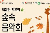 [인천광역신문] 최예준 기자 | 인천시 중구는 문화와 나들이의 계절 가을을 맞이해 오는 11월 1일 오후 2시부터 백운산 치유의 숲(운남동 산120-1)에서 ‘백운산 치유의 숲 숲속음악회’를 개최한다. 이번 음악회는 인천 중구가 ‘2025년 산림치유 프로그램 운영 사업’의 일환으로 올해 처음 선보이는 행사다. 특히 숲속에서 ‘음악회’와 ‘전문 산림치유 프로그램’을 함께 즐길 수 있는 것이 특징이다. 행사에서는 스카이드림기타앙상블, 아리솔 우쿨렐레 앙상블, 송월장로교회 브라스코이노니아, 경기도 무형유산 제38호 풀피리 이수자의 무대 등 다양한 단체의 재능기부로 진행된 음악 문화 공연이 펼쳐질 예정이다. 또한, 문화 공연 사이사이마다 온몸 스트레칭, 명상, 건강 박수 등 전문 산림치유지도사와 함께하는 다채로운 ‘힐링·건강 프로그램’이 준비돼 있어 축제를 더욱 풍성하게 만들 전망이다. 행사를 주최한 한국숲해설가협회 관계자들은 “첫 축제이니만큼, 많은 시민이 함께해 주셨으면 좋겠다”라며 “산림치유 프로그램에도 시민들의 많은 관심과 참여를 바란다”라고 전했다. 한편, 인천 중구 운