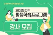 [인천광역신문] 박진 기자 | 인천광역시교육청중앙도서관은 지역 주민에게 다양한 학습 기회를 제공하기 위해 ‘2026년 평생학습프로그램’ 강사를 공개 모집한다. 2026년 정규 평생학습프로그램은 상반기(3~5월)와 하반기(9~11월)로 나뉘어 각각 8회씩 운영되며, 모집 분야는 유아 대상 독후활동, 초등 1~2학년 대상 초등 영어, 성인 대상 AI 활용과 동영상 제작, 우쿨렐레, 금융·경제 등 총 5개 분야다. 서류 접수는 12월 23일부터 29일 오후 5시까지이며, 중앙도서관 누리집 공지사항에서 제출 서식을 내려받아 작성한 뒤 관련 서류와 함께 이메일로 제출하면 된다. 강사는 1차 서류심사와 2차 면접심사를 거쳐 최종 선정된다. 자세한 사항은 중앙도서관 누리집에서 확인할 수 있으며, 문의는 마을교육지원과로 하면 된다. [뉴스출처 : 인천광역시교육청]