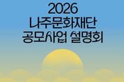 [인천광역신문] 관리자 기자 | 나주문화재단이 2026년도에 추진할 문화사업 전반을 시민과 공유하고 공모 참여 기회를 확대하기 위해 설명회를 개최한다. 나주문화재단은 오는 2월 24일 나빌레라문화센터 소극장에서 ‘2026년 나주문화재단 통합 공모사업설명회’를 연다고 13일 밝혔다. 이번 설명회는 지역민과 예술인을 대상으로 재단의 연중 사업을 종합적으로 안내하고 공모사업 참여를 독려하기 위해 마련했다. 재단은 2026년 추진 예정 사업 전반과 함께 총 5건의 공모사업 개요, 신청 방법, 서식 작성 요령 등을 상세히 설명할 계획이다. 설명 대상 사업은 나주형 커뮤니티 발굴사업 ‘취향살롱’, 지역문화 활성화 지원사업, 나빌레라문화센터 전시공간 지원 공모, 나빌레라문화센터 창작실 입주작가 공모, 미디어 콘텐츠 촬영 장소 지원 등 5건이다. 설명회에서는 사업 안내와 더불어 현장 질의응답 시간을 운영해 시민과 예술인의 이해도를 높이고 다양한 의견을 수렴할 예정이다. 이를 통해 재단과 지역 문화 주체 간 소통을 강화하고 정책 반영의 기반을 마련한다는 방침이다. 특히 직장인