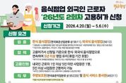 [인천광역신문] 최예준 기자 | 음식점업 외국인 근로자 '26년도 2회차 고용허가 신청 ■ 신청기간: 2026.4.20.(월)~5.6.(수) ■ 신청 요건 · 업종 한식 음식점업(한국표준산업분류 상 5611), 외국식 음식점업(5612) *고용보험 시스템에 등록된 업종 기준(실제 영업을 영위하는지 여부 등은 '사업자등록증' 또는 '영업신고증'으로 증빙) *기관구내식, 출장이동식, 기타간이, 주점, 비알코올 음료점은 미허용 · 업력 고용허가서 신청일 기준으로 한식·외국식 음식점업으로 연속하여 5년 이상 영업 유지(휴업 기간 포함) *부가가치세 과세표준증명원상 과세기간 또는 사업자등록증상 '개업년·월·일'로 확인 · 고용인원 내국인 근로자 1인 이상 5인 미만 사업장은 1명, 5인 이상 사업장은 2명까지 가능 *내국인근로자(피보험자) 수는 고용부에서 고용보험시스템 전산 확인 · 직무 주방보조원(한국표준직업분류 상 95220) 및 음식 서비스 종사원(45311) *현장 여건에 맞게 직무범위 탄력적 운영 가능 · 문의 - 고용노동부 상담센터 ☎1350 · 신청 - 사업
