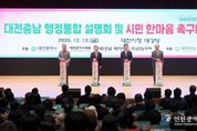 [인천광역신문] 관리자 기자 | 대전시의회 조원휘 의장은 12일 대전시청에서 개최된 대전충남 행정통합 설명회 및 시민 한마음 촉구대회에 참석해 지방소멸 위기 속에서 진행되는 대전·충남 행정통합 특별법안의 조속한 의결을 시민들과 함께 촉구했다. 이번 행사는 지역을 대표하는 단체·기관장, 민관협의체, 직능·사회단체 등 600여 명이 참석한 가운데 행정통합 홍보영상 상영을 시작으로 주요내빈 인사말씀, 행통통합 설명, 촉구문 낭독 및 퍼포먼스 순으로 진행됐다. 조원휘 의장은 “지방 소멸, 수도권 1극 체제라는 국가적 위기 속에서 행정통합은 대전과 충남의 생존과 미래에 대한 가장 현실적이고 강력한 해답이고, 두 지역이 힘을 모으면 인구 350만 명, 지역내총생산 200조 원의 대한민국 3대 생활권을 이뤄내는 것이다”라면서, “대전시의회는 행정통합특별위원회를 출범해 제도 개선 및 시민 공감대 형성 등 선제적 정책 마련에 총력을 기울여 왔고, 앞으로도 국회와 국가 차원의 협력을 도모해 충청권이 대한민국 100년을 이끌 새로운 성장 축이 되도록 시민들과 함께 힘을 모아 반드시 이뤄내겠다”고 말했다. [뉴스출처 : 대전시의회]