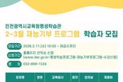 [인천광역신문] 관리자 기자 | 인천광역시교육청평생학습관은 오는 23일부터 ‘재능기부 프로그램’을 운영한다. 이번 프로그램은 시민이 강사로 참여해 자신의 전문성과 경험을 공유하는 참여형 평생학습 활동으로, 매월 새로운 주제의 강좌를 통해 생활 속 배움의 기회를 제공한다. 2월부터 운영되는 강좌는 ‘시니어 요가’, ‘시니어 필라테스’, ‘근력 스트레칭’, ‘나를 닮은 꽃그림’, ‘내 마음속의 논어’ 등 총 5가지이다. 수강 신청은 11일 오전 10시부터 평생학습관 누리집에서 선착순으로 진행되며, 자세한 사항은 누리집의 공지사항을 확인하거나 평생교육부로 문의하면 된다. [뉴스출처 : 인천시교육청]
