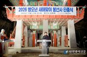 [인천광역신문] 박진 기자 | 진접읍 봉선사에서 2026년 희망 가득한 새해를 기원하는 제야의 종소리가 울려 퍼졌다. 남양주시의회(의장 조성대)는 31일 진접읍에 위치한 대한불교조계종 제25교구 봉선사(주지 호산스님)에서 열린‘2026년 봉선사 새해맞이 타종식’에 참석해 시민들과 함께 병오년(丙午年) 새해의 힘찬 출발을 함께했다. 봉선사가 주관한 이날 행사는 조성대 의장을 비롯해 이정애 부의장, 이경숙 복지환경위원장, 김지훈(국) 의원, 김동훈 의원, 이수련 의원, 김상수 의원, 손정자 의원 및 주광덕 남양주시장, 지역 국회의원, 봉선사 관계자 및 신도, 지역주민 등 300여명이 참석했다. 행사는 송년법회를 시작으로 △교구장 호산스님의 인사말씀 △새해 덕담 및 송년 인사 △발원문 △봉선사 대종 소개 △타종 순으로 진행됐으며, 한파로 인한 추운 날씨 가운데서도 타종식에 참석한 시의원들과 시민들은 덕담과 따뜻한 온기를 나누며 훈훈한 새해를 함께 맞이했다. 특히, 주요 내외빈의 타종 이후 일반 시민들도 함께 타종자로 참여하는 순서를 마련해 새해맞이 타종식의 의미를 더했다. 조성대 의장은 “