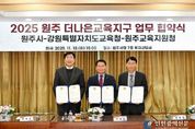 [인천광역신문] 관리자 기자 | 원주시는 지난 18일 시청 7층 투자상담실에서 ‘원주 더나은교육지구’ 지정 연장 업무협약을 체결했다. 협약식에는 원강수 원주시장, 신경호 강원특별자치도 교육감, 김성진 원주교육지원청 교육장이 참석했다. 더나은교육지구는 원주시와 강원특별자치도교육청, 원주교육지원청이 협약을 통해 구축하는, 마을과 학교가 함께하는 지역 교육공동체다. 이번 협약은 1기(2018-2021)와 2기(2022-2025)에 이어 추진되는 3기 사업으로, 2026년부터 2029년까지 4년간 운영된다. 원주시와 도 교육청이 매년 각각 2억 원씩, 총 16억 원의 사업비를 지원한다. 3기 사업 지난 사업 추진 실적을 바탕으로 새롭게 개편됐으며, ‘배움과 성장, 문화예술로 동행하는 원주’를 비전으로 4개의 추진 과제와 12개의 세부 사업으로 구성됐다. 이를 통해 지역과 학교가 함께 성장하는 교육 기반을 더욱 강화할 계획이다. 특히 3기에서는 비전에 걸맞은 다양한 문화예술 프로그램이 추진된다. 원주의 특화 산업인 한지 교육을 통해 민·관·학 협력 분위기를 조성하고, 지역 문화·관광 자원을 직접 체험할 수
