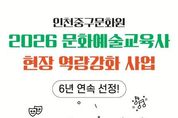 [인천광역신문] 관리자 기자 | 인천중구문화원(원장 박봉주)이 문화체육관광부와 인천광역시가 주최하고, 인천문화재단 인천문화예술교육지원센터와 한국문화예술교육진흥원이 주관하는 '2026 문화예술교육사 현장 역량강화 사업(인천)'에 6년 연속 선정되는 쾌거를 달성했다. ‘문화예술교육사 현장 역량강화 사업’은 문화예술교육사의 전문성 강화를 통해 지역의 문화예술교육 역량을 높이고, 주민들을 위한 우수한 문화예술교육 프로그램 개발과 운영을 지원하는 사업이다. 인천중구문화원은 지난 5년간의 성공적인 사업 운영 성과를 인정받아 올해도 본 사업에 연속 선정되며, 지역 문화예술교육의 거점으로서 입지를 공고히 했다. 특히, 오는 7월 예정된 인천시 행정체제 개편에 따라 ‘인천영종구문화원’으로의 새로운 출발을 앞두고 있어 그 의미가 더욱 남다르다. 올 하반기부터 인천중구문화원은 ‘영종구’로 거점을 이전하여 지역적 특성을 반영한 새롭고 다채로운 문화예술교육 프로그램을 선보일 계획이며, 이에 발맞춰 영종구에서 새롭게 호흡을 맞추며 프로그램을 기획·운영할 역량 있는 신규 문화예술교육사 채용 진행중에 있다. 인천중