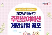 [인천광역신문] 관리자 기자 | 서울 용산구가 4월 24일까지 2027년 예산에 반영할 주민참여예산 사업을 공모한다. 생활안전, 문화, 복지 등 주민 생활과 밀접한 분야를 대상으로, 총규모는 10억 원이다. 일반사업은 사업당 2억 원 이내, 행사성 사업은 1500만원 이내로 제안할 수 있다. 단, 이미 시행 중인 사업이나 법령‧조례상 부적합한 사업, 구 소관사무가 아닌 사업, 특정 민간단체지원을 목적으로 하는 사업 등은 선정 대상에서 제외한다. 사업 제안은 용산구민과 용산구에 소재지를 둔 사업체 임직원이나 학생이라면 모두 가능하다. 신청은 기간 내 ▲구 누리집 ‘참여소통-주민참여예산제-용산구 예산 이렇게 사용해주세요!’ 게시판 ▲방문(용산구청 기획예산담당관 및 각 동주민센터) ▲우편(녹사평대로 150, 8층 기획예산담당관) ▲전자우편 중 편한 방법으로 제출하면 된다. 제안 양식은 구 누리집 ‘주민참여예산 게시판’에서 내려받을 수 있다. 접수한 제안 사업은 ▲동 지역 회의 ▲소관부서 검토 ▲주민참여예산위원회 심사 절차를 거쳐 최종 선정한다. 이후 구의회 심의를 통해 2027년 예산으로 확정할 예정이다. 주민참여예
